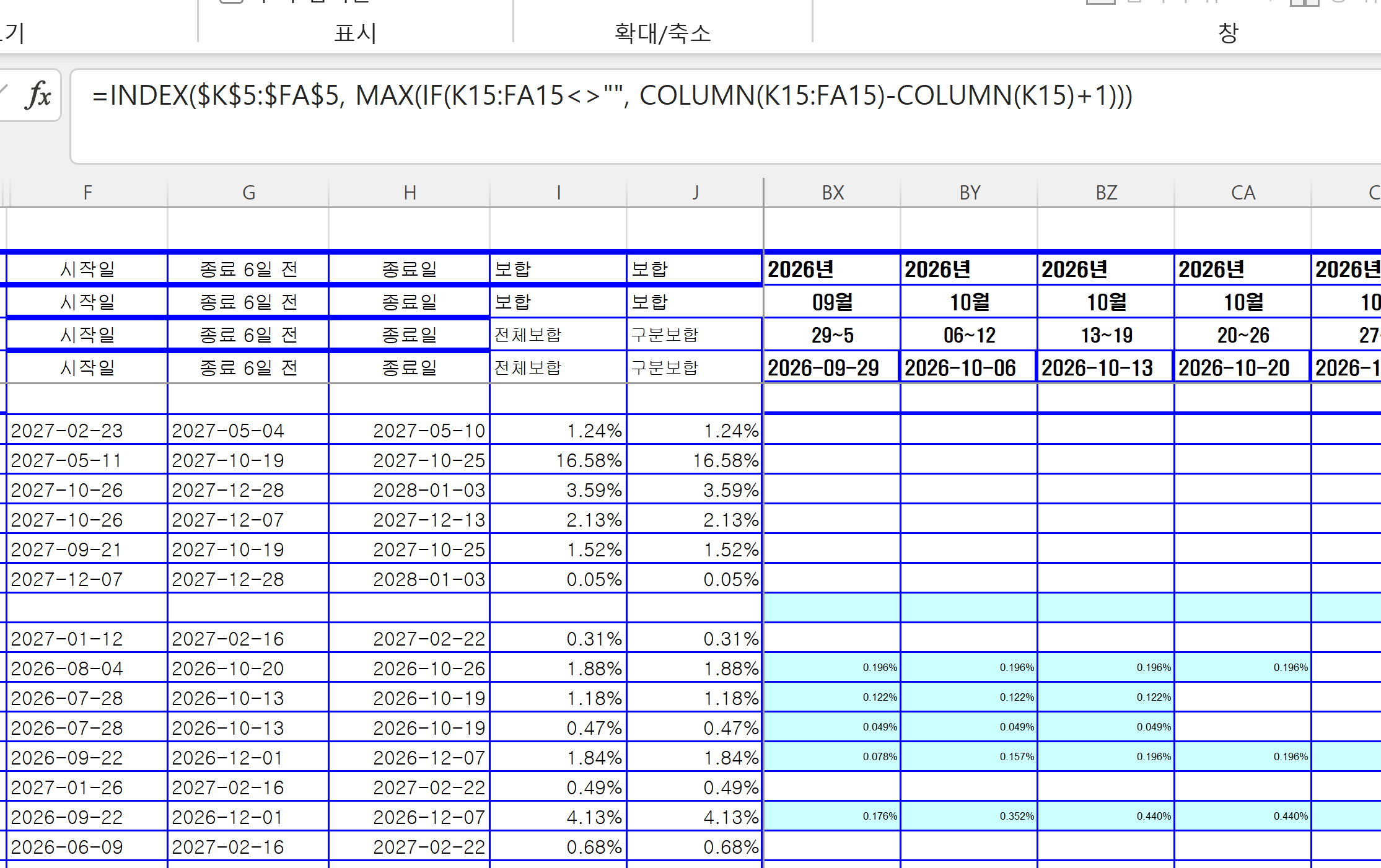 =INDEX($K$5:$FA$5, MAX(IF(K7:FA7<>"", COLUMN(K7:FA7)-COLUMN(K7)+1)))
